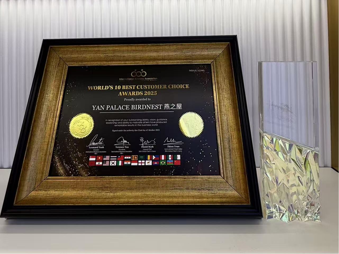 圖:燕之屋榮獲2025國際商業(yè)協(xié)會(IBA)大獎——全球十大最佳客戶選擇獎